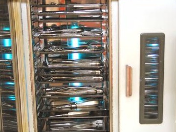 田村歯科クリニックでは、少しでも皆さんが安全・安心して治療を受けられるような院内感染防止対策を徹底しております。その院内感染防止対策のための衛生管理の基幹となるのは滅菌/殺菌処理です。治療で使用した器材は洗浄後に「オートクレーブ」で滅菌しています。また滅菌後の器材は専用のケースに安全に保管しています。